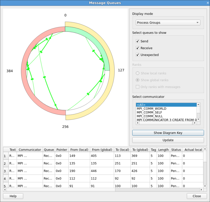To see the ‘usual’ ranks, select Show global ranks. The messages displayed can be restricted to particular processes or groups of processes. To restrict the display in the grid to a single process, select Individual Processes in Display mode, then select the rank of the process. To display a group of processes, select Process Groups in Display mode then select the ring arc corresponding to the required group. Both of these display modes support multiple selections.