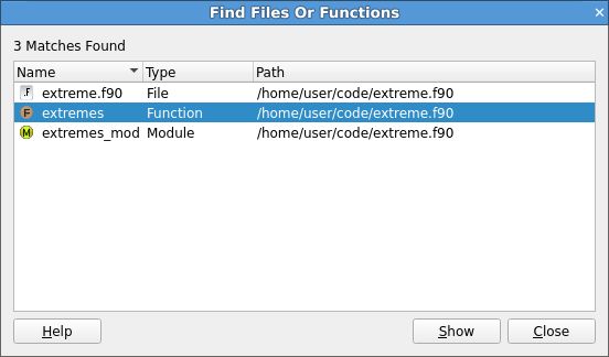 You can type the name of a file, function, or other source code element (such as classes, Fortran modules, and so on) in this dialog to search for that item in the source tree. You can also type just part of a name to see all the items with name that contains the text you typed.