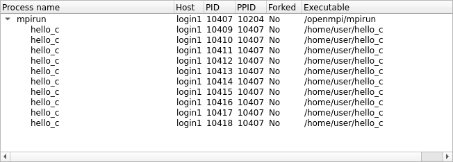 With some supported MPI implementations (for example, Open MPI) Linaro DDT shows MPI processes as children of the (or equivalent) command.