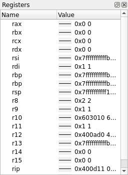 To view the values of machine registers on the currently selected process, select . These values will be updated after each instruction, change in thread, or change in stack frame.