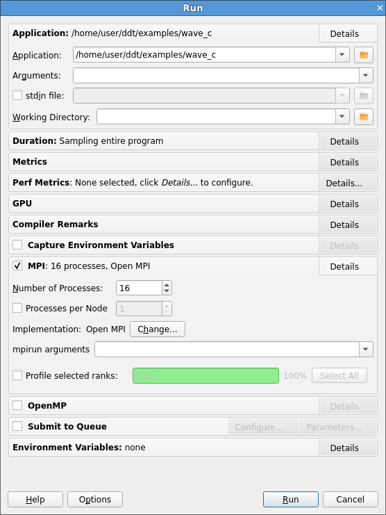 If you only have a single process license or have selected none as your MPI Implementation, the MPI options will be missing. The MPI options are not available when in single process mode. See Profile a single-process program for more details about using a single process.