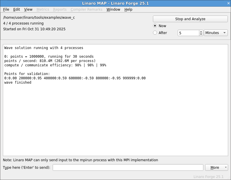 #include "mapsampler_api.h"and call theallinea_start_samplingfunction. You must point your C compiler at the Linaro MAP include directory, by passing the arguments-I /path/to/forge/map/wrapperand also link with the Linaro Forge sampler library, by passing the arguments-L /path/to/forge/lib/64 -lmap-sampler.To stop sampling programmatically call the