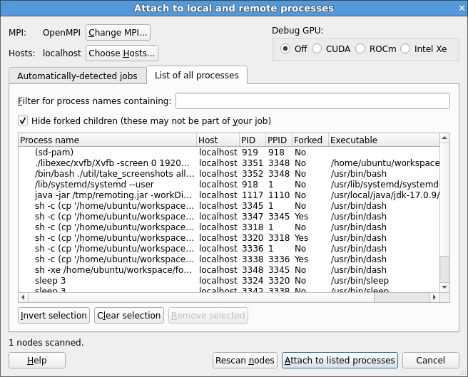 Each remote host is scanned for processes, and the result is displayed in the Attach window. If you have trouble connecting to remote hosts, see Connecting to compute nodes and remote programs (remote-exec).