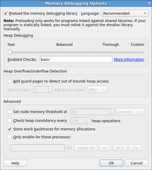 When this is selected, the memory debugging library will be automatically loaded. The memory debugging library can only preload when you start a program. It uses shared libraries.
