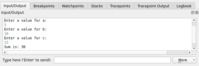It is also possible to enter input during a session. To do this, start your program as normal, then open the Input/Output tab. Type the input you want to send.
