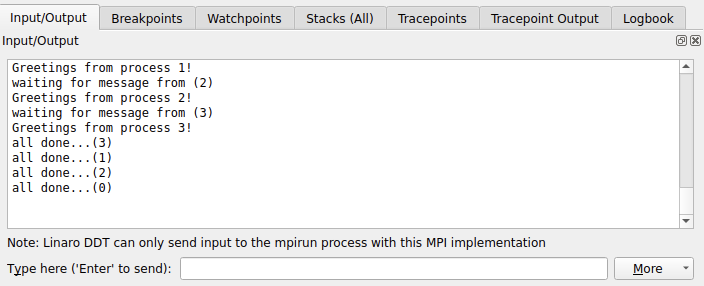 The output from all processes is collected and can be viewed on the Input/Output tab. Standard output and error are both displayed. However, on most MPI implementations, error is not buffered (output is buffered), so might be delayed.