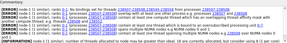 The Node topology viewer matches the expected hardware topology. The red background indicates that process bindings are overlapping: