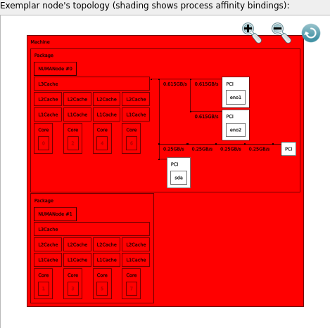 In this scenario, the SLURM job is run across 8 compute nodes. Each node is fitted with 2 CPU packages, associated with a single NUMA node each. Each CPU package comprises a single L3 cache shared between 4 physical cores. SMT is not in use.