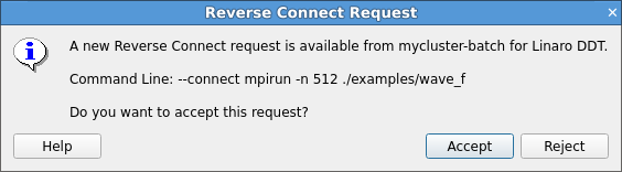 Linaro Forge connects to the specified host and executes what you specified with the command line. If you do not want to accept the request, click Reject.